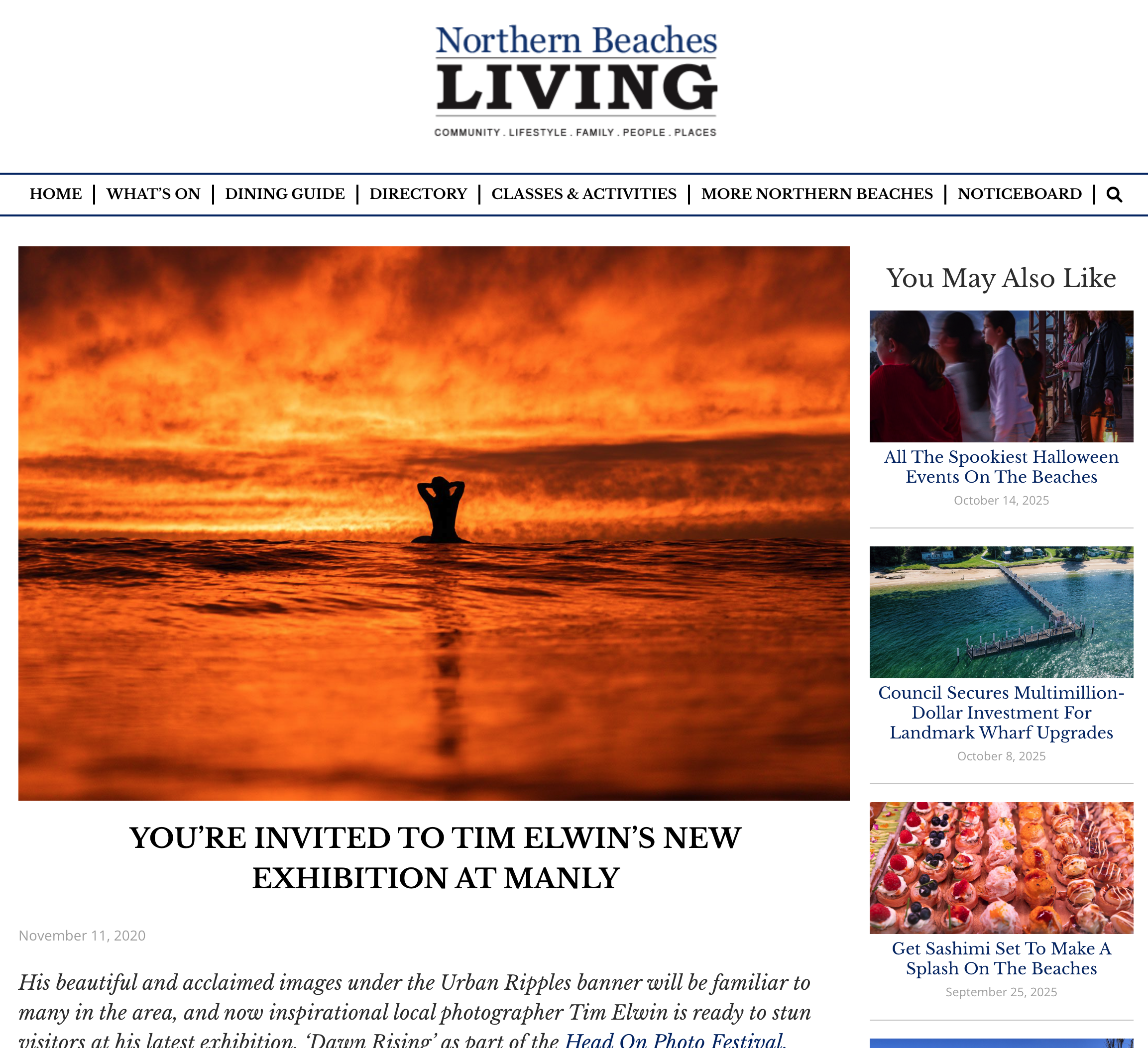 Northern Beaches Living previews Tim Elwin’s ‘Dawn Rising’ exhibition, part of the Head On Photo Festival. The article highlights Tim’s journey from lifestyle photography to capturing surreal, abstract scenes from within the ocean at dawn. It also touches on his personal story of overcoming a serious accident, and his mission through Urban Ripples and Print-for-Print to bring art into public hospitals.